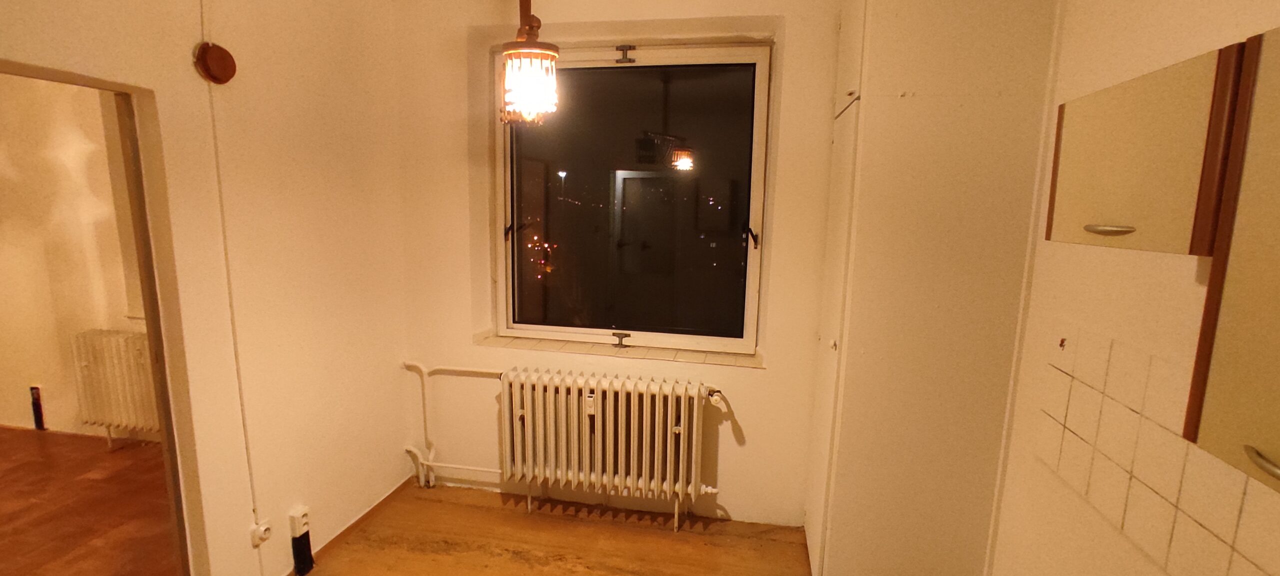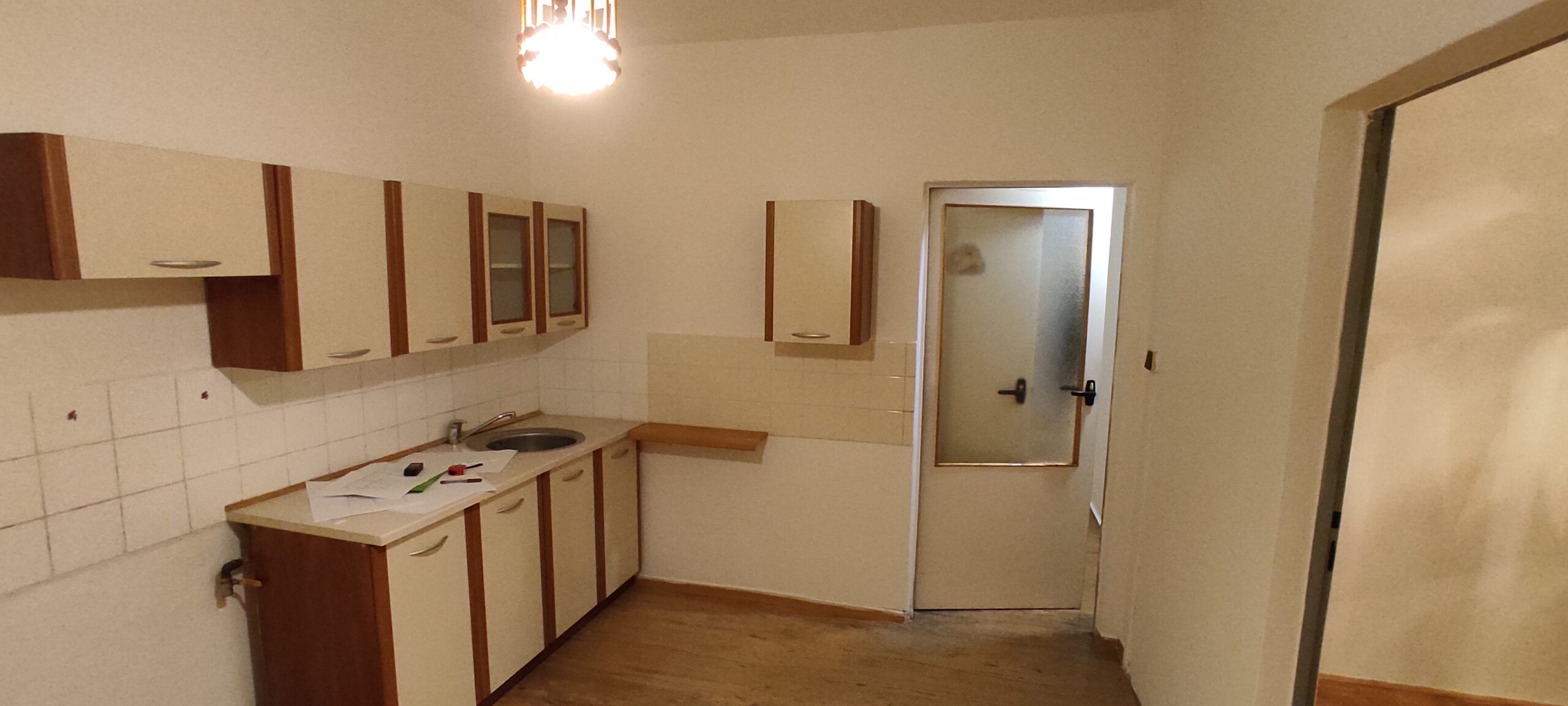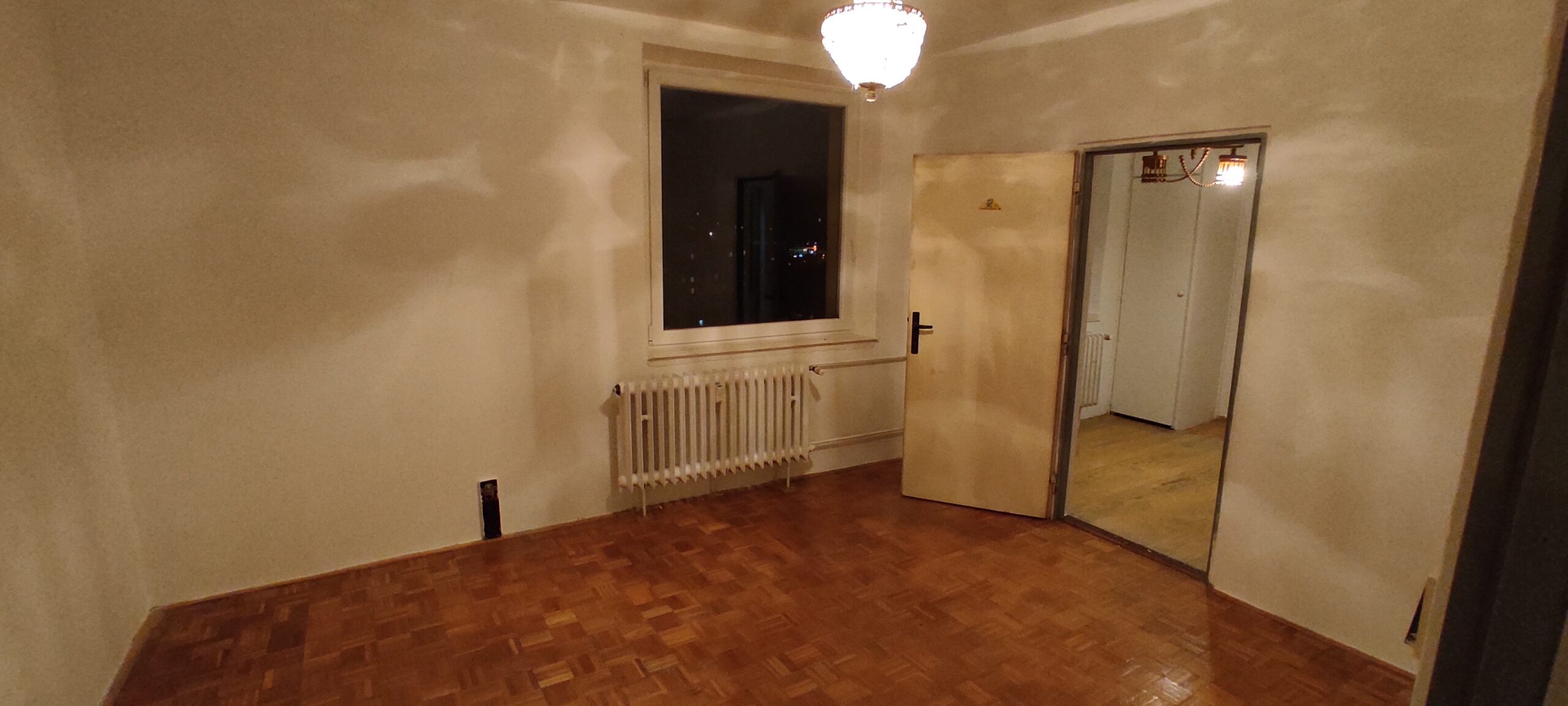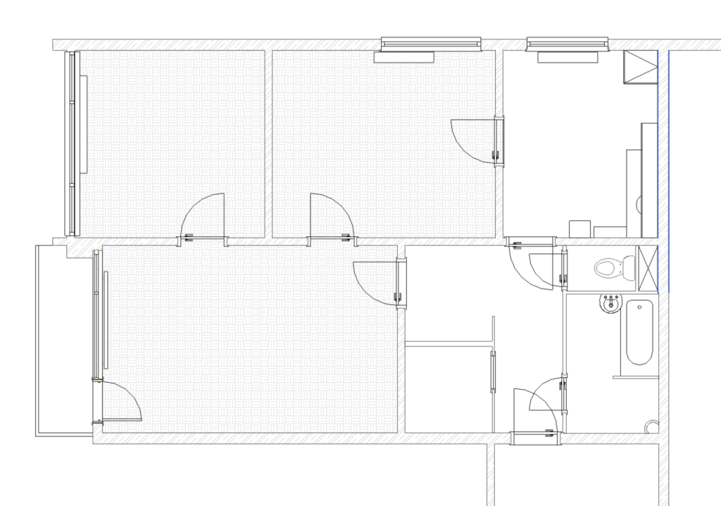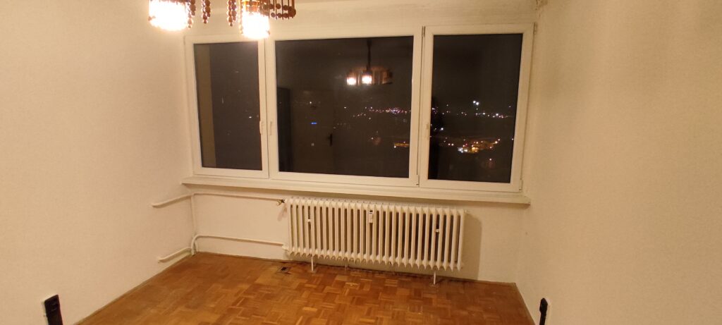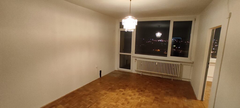 The apartment has been cleaned down to the rough structure, retaining the newer windows and original parquet floors. A complete refurbishment of the electrical wiring has been carried out with a view to modern layout and ample terminations. The ceilings and walls were stripped of old stucco and refaced with new. The wood floors were refinished, while durable linoleum was laid in other areas. The sanitary facilities were fitted with large format tiles, tiles and a mirror to visually enlarge the space. We also added a counter and built-in cabinet to provide a practical storage solution. The kitchen was designed as a linear assembly with a continuous work surface to ensure maximum functionality and working comfort.