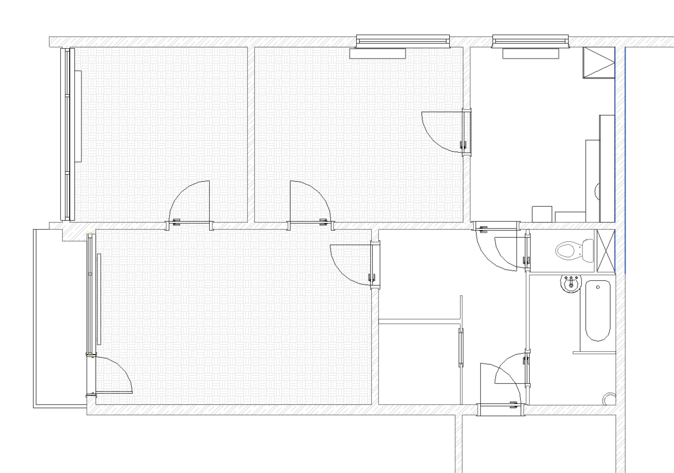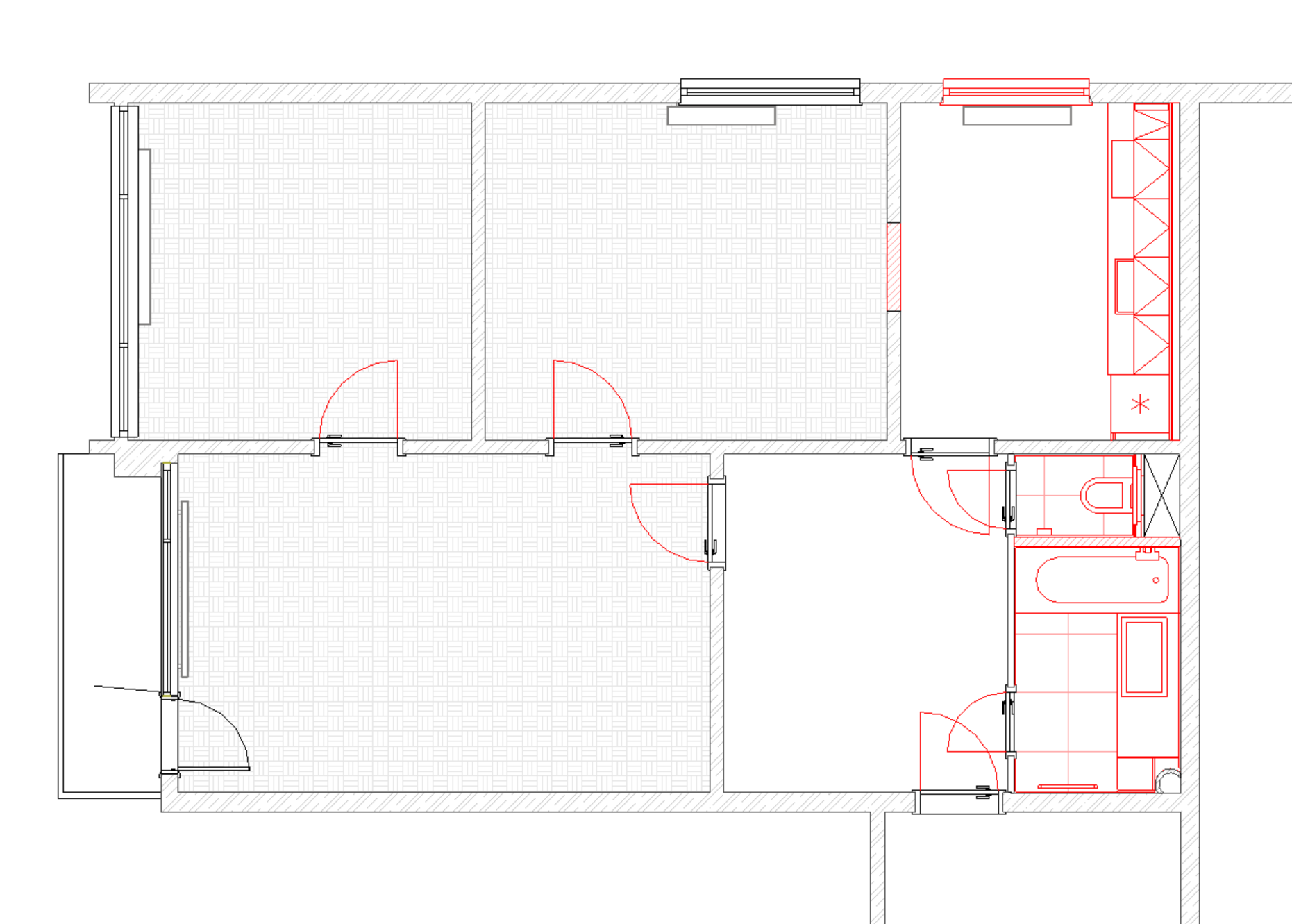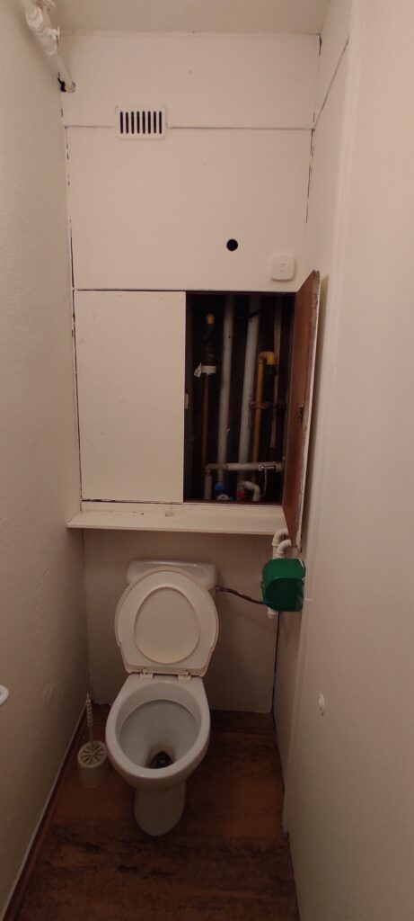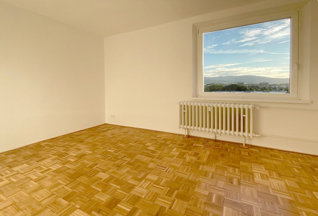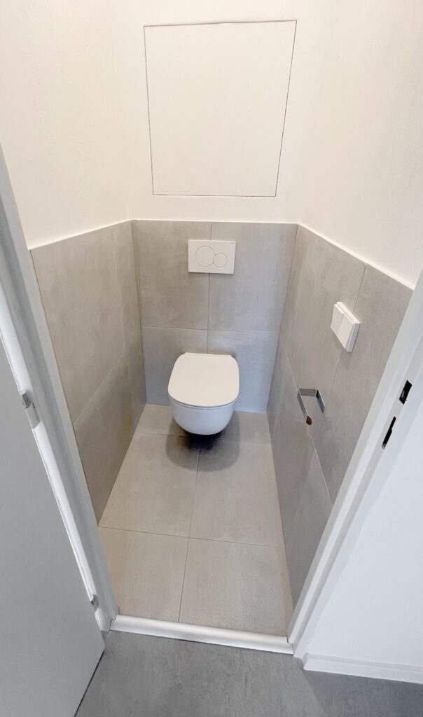 The apartment has been cleaned down to the rough structure, retaining the newer windows and original parquet floors. A complete refurbishment of the electrical wiring has been carried out with a view to modern layout and ample terminations. The ceilings and walls were stripped of old stucco and refaced with new. The wood floors were refinished, while durable linoleum was laid in other areas. The sanitary facilities were fitted with large format tiles, tiles and a mirror to visually enlarge the space. We also added a counter and built-in cabinet to provide a practical storage solution. The kitchen was designed as a linear assembly with a continuous work surface to ensure maximum functionality and working comfort.